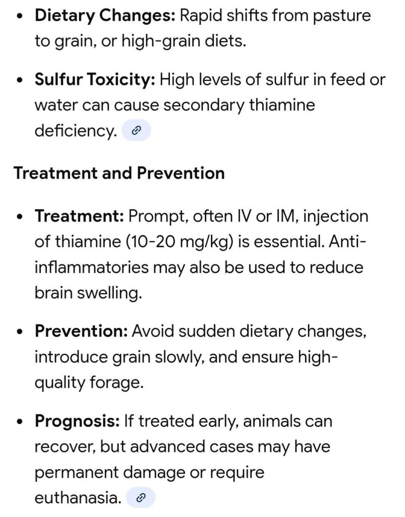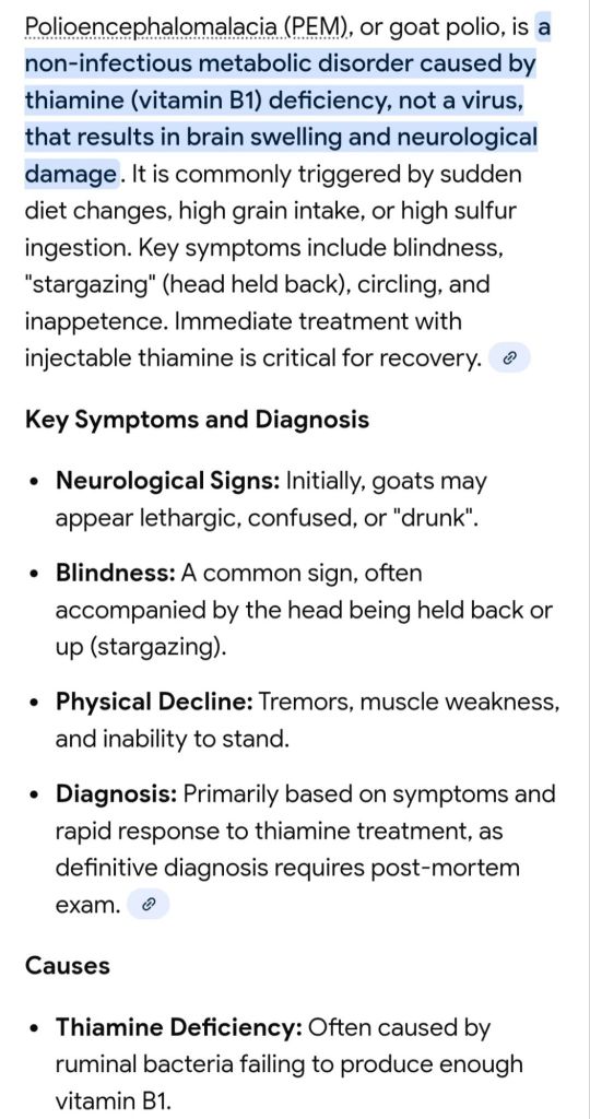 Someone else–understanding at least that “goat polio” is not poliovirus–will impress upon you the need to immediately treat every animal in your herd for thiamine deficiency.