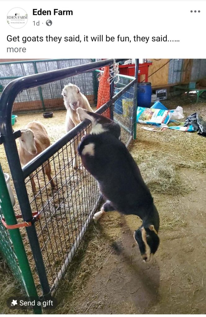 *I wanted to mention, my goats aren’t generally jumpers. My fences range from 4′ to 4’6″, in special cases 5′, and it is so incredibly rare to ever have one jump out. I only have two stories of goats who routinely jumped over fences, one being Elvis, the mini LaMancha buck–recently passed and greatly missed–who lived most of his life behind 5′ panels because he was a menace…um, I mean, a gifted athlete. His story is on my FB page, Van-Goght LaManchas.